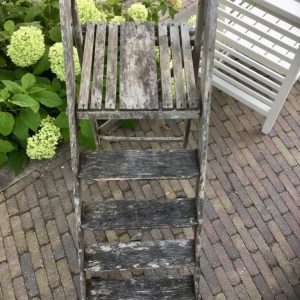 Stevig houten trapje, waarmee de treden stevig verankerd zitten in de steunen. Trede 3 is duidelijk ooit als werkbank gebruikt door iemand die ergens gaatjes in moest boren.