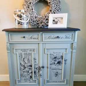 Dit kastje mochten we al een hele tijd geleden ophalen uit de schuur van een bevriende boer. Dit was wel een project waarover we twijfel hadden of dit een haalbaar reparatietraject zou worden. Deze was namelijk bij binnenkomst het stadium gammel reeds lang gepasseerd. Hij stond in ons klushok met een spanbandje eromheen om maar niet uit elkaar te vallen. Maar hoe zieliger de staat van het kastje, hoe groter de uitdaging! We hebben van de gelegenheid gebruik gemaakt om een voor ons nieuwe techniek uit te proberen: transfers. We zijn zelf erg blij met de bloemetjes en de bijtjes. Al onze kastjes zijn op hun eigen manier uniek, maar deze is nog net een beetje unieker!