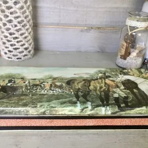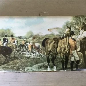 Langwerpig koekblik van Victoria met een zeer gedetailleerd jachttafereel op het deksel.