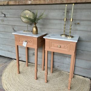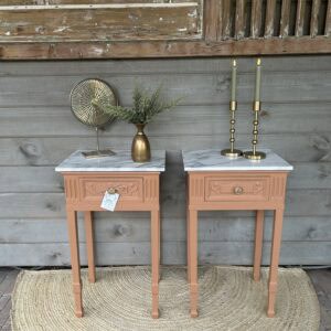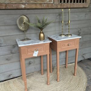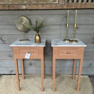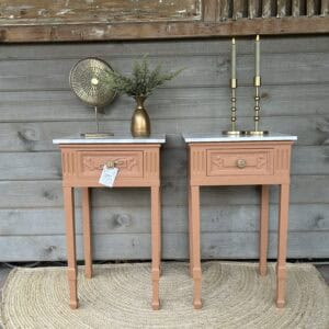 Set nachtkastjes gerestyled door Leukgevonden en geschilderd in de kleur Chestnut Mare van Fusion minarel Paint.
