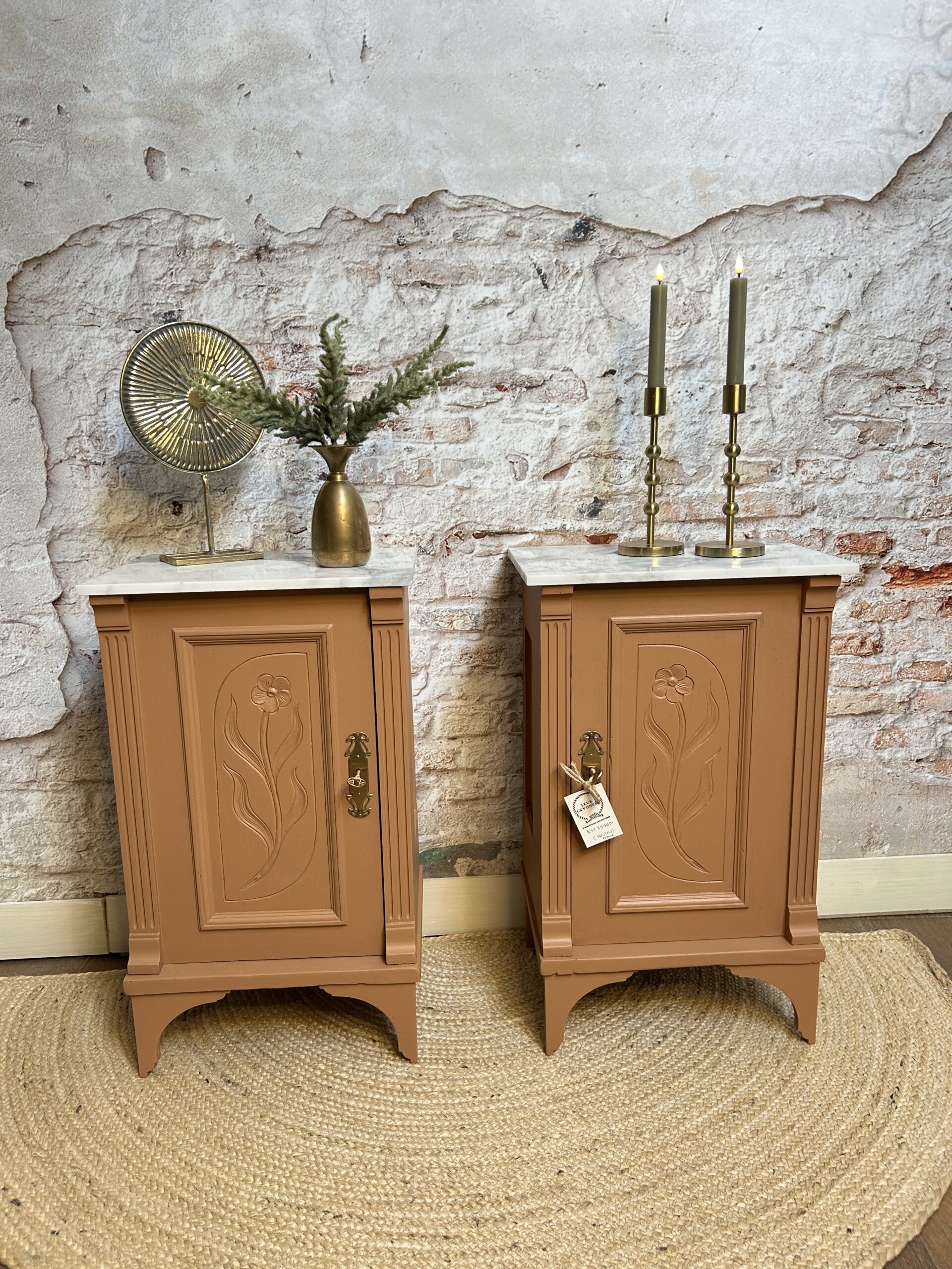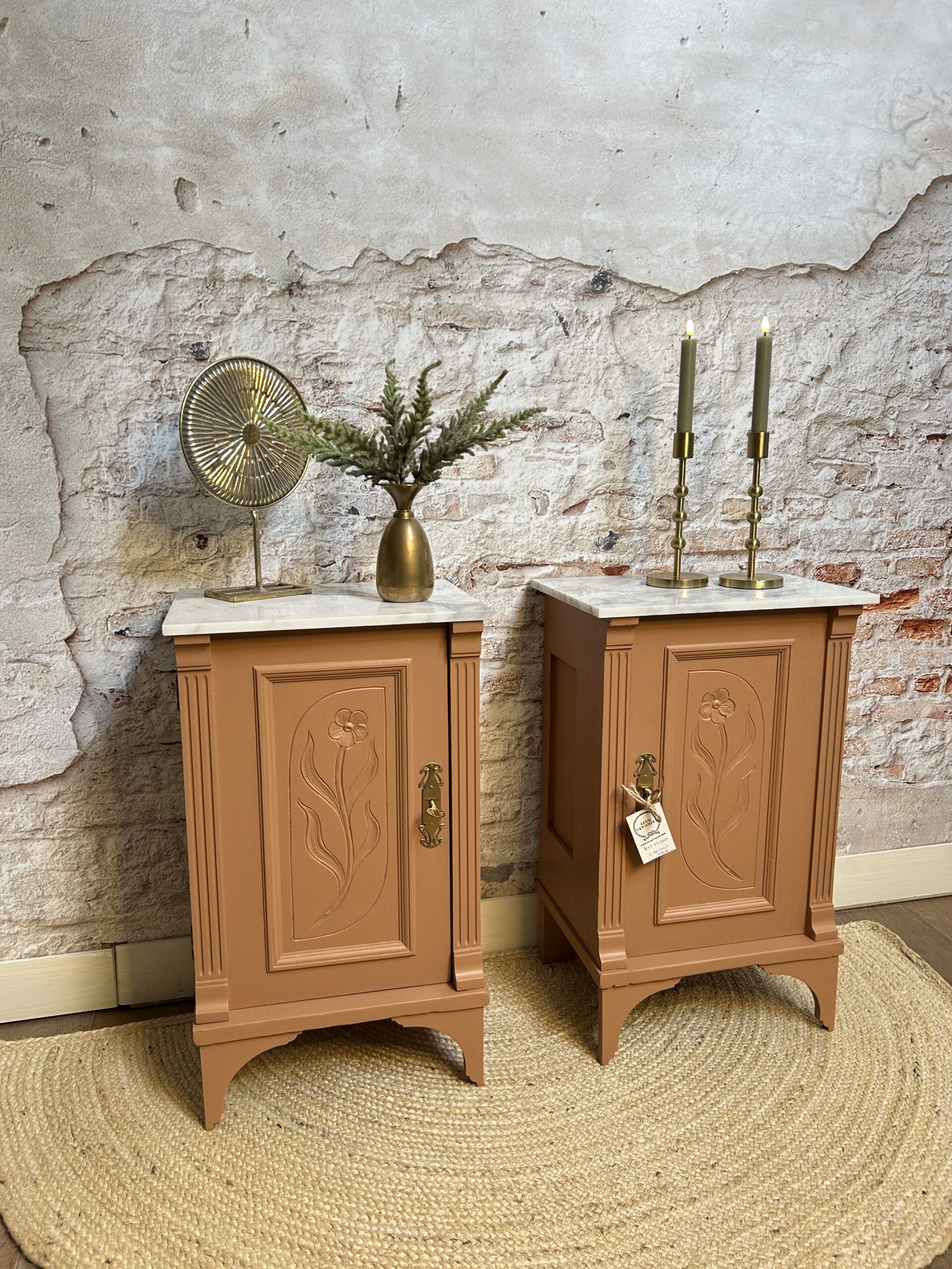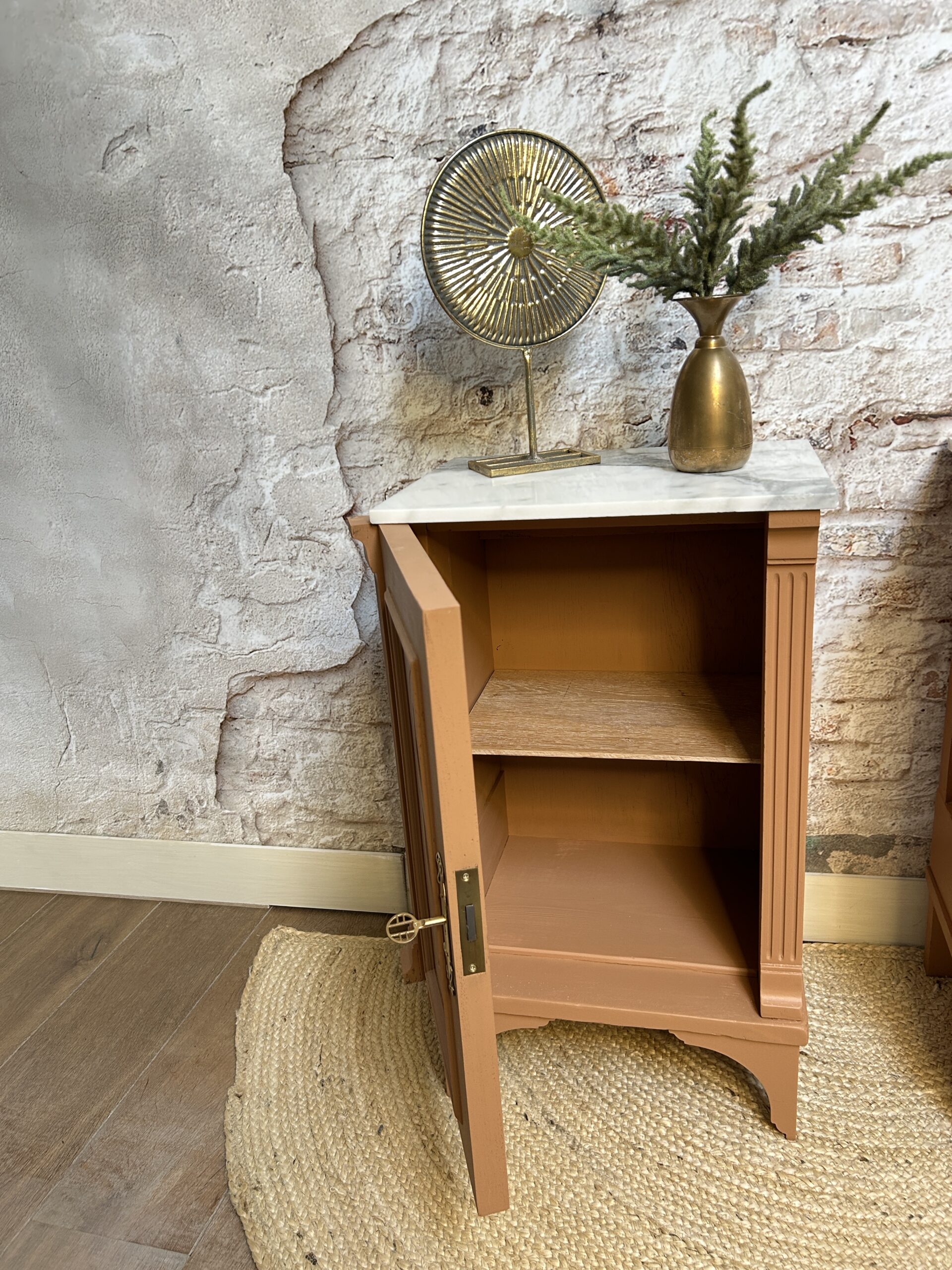 Set nachtkastjes met marmerenblad gerestyled door Leukgevonden en geschilderd in de kleur Chestnut Mare van Fusion minarel Paint.