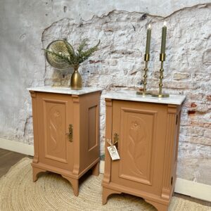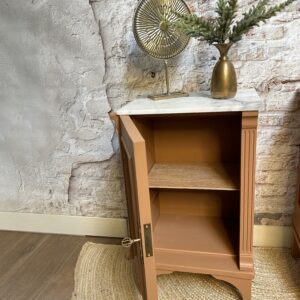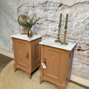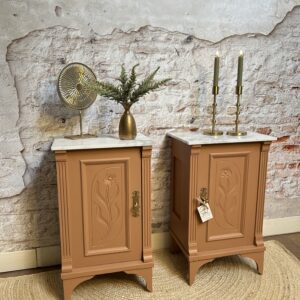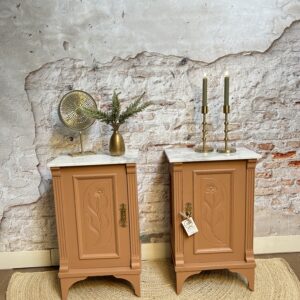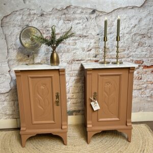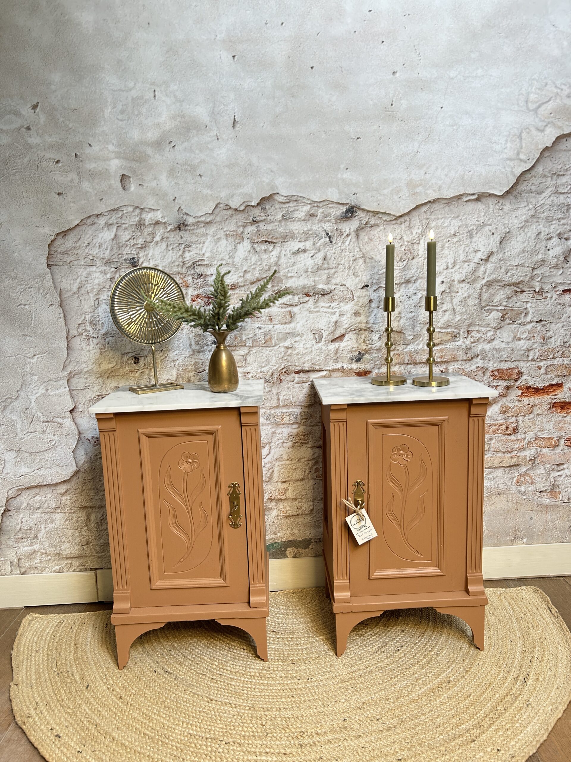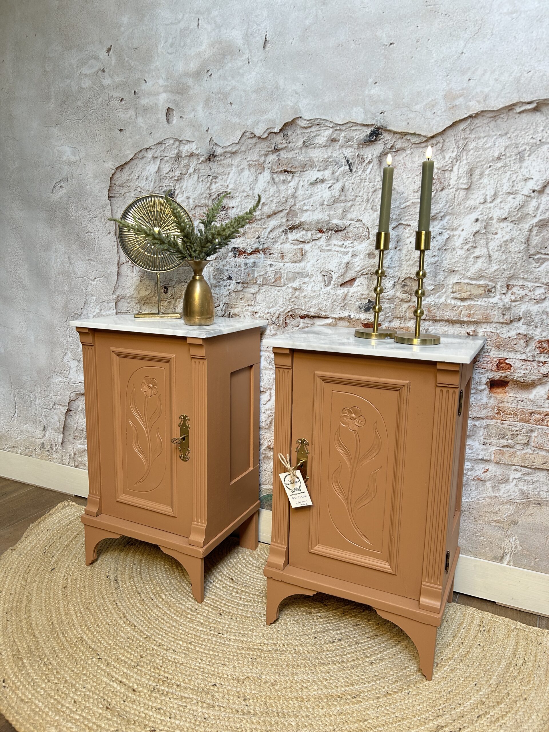 Set nachtkastjes met marmerenblad gerestyled door Leukgevonden en geschilderd in de kleur Chestnut Mare van Fusion minarel Paint.