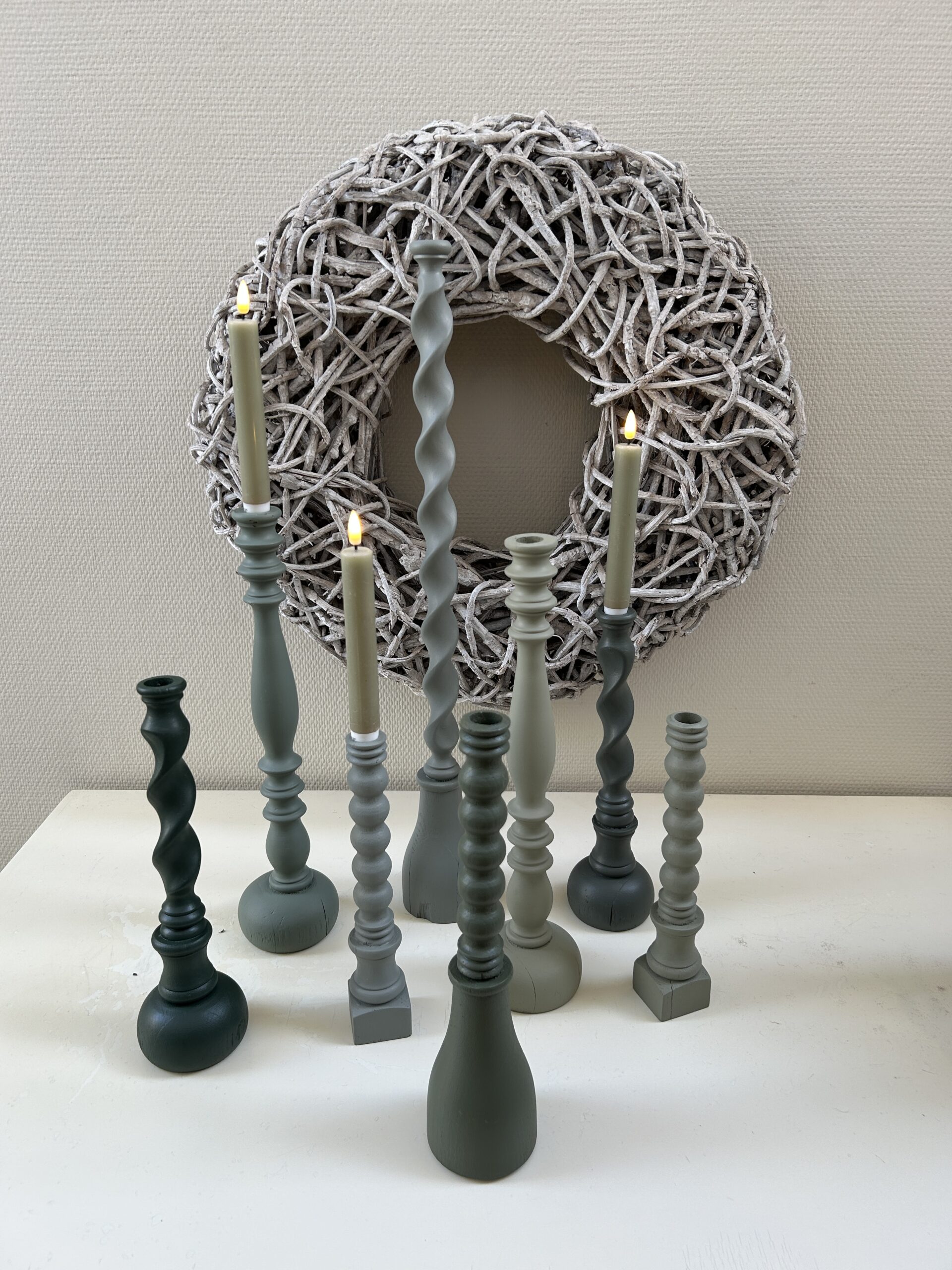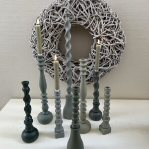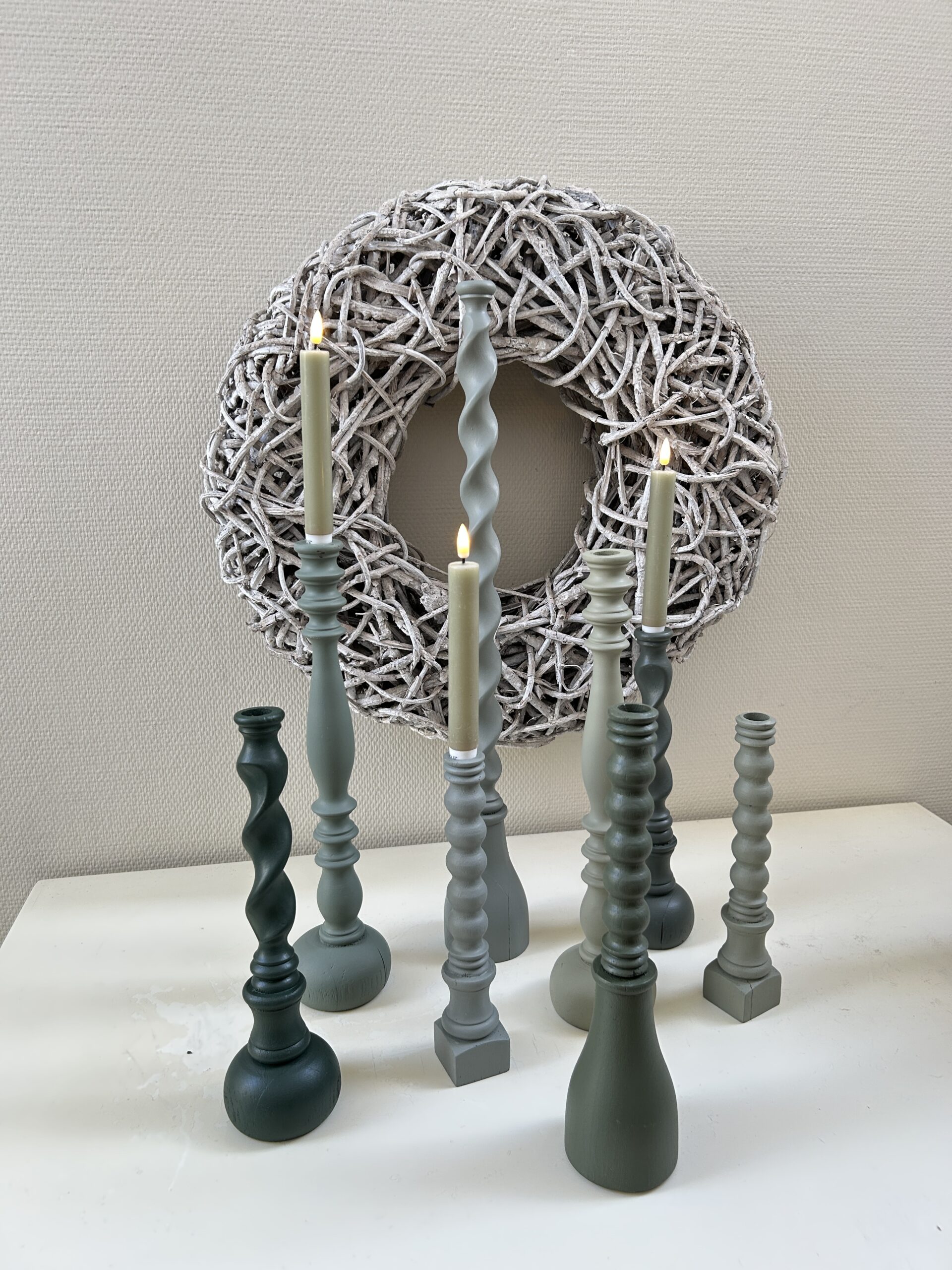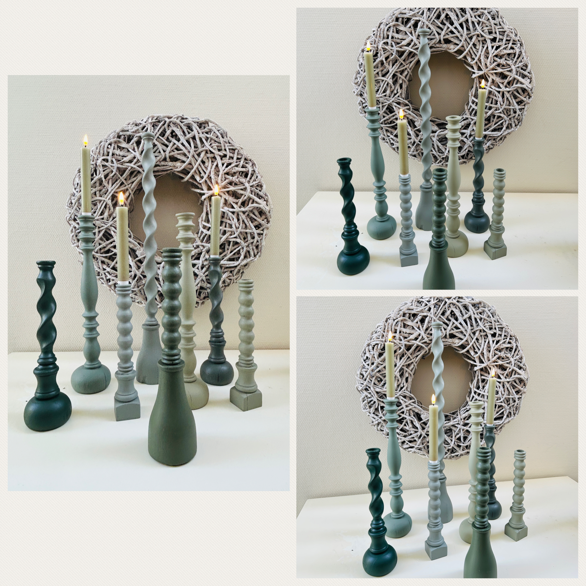 Sfeervolle kandelaars, gemaakt van oude tafel en kastpoten en door ons omgetoverd tot acht sfeervolle kandelaars.