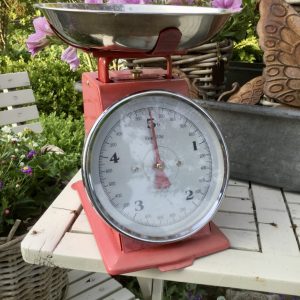 Ouderwetse weegschaal, zo eentje die je niet in je keukenkast wil zetten, tenzij die glazen deurtjes heeft. Hoeft uiteraard niet persé in je keuken, kan op veel andere plaatsen ook een decoratieve toevoeging zijn.